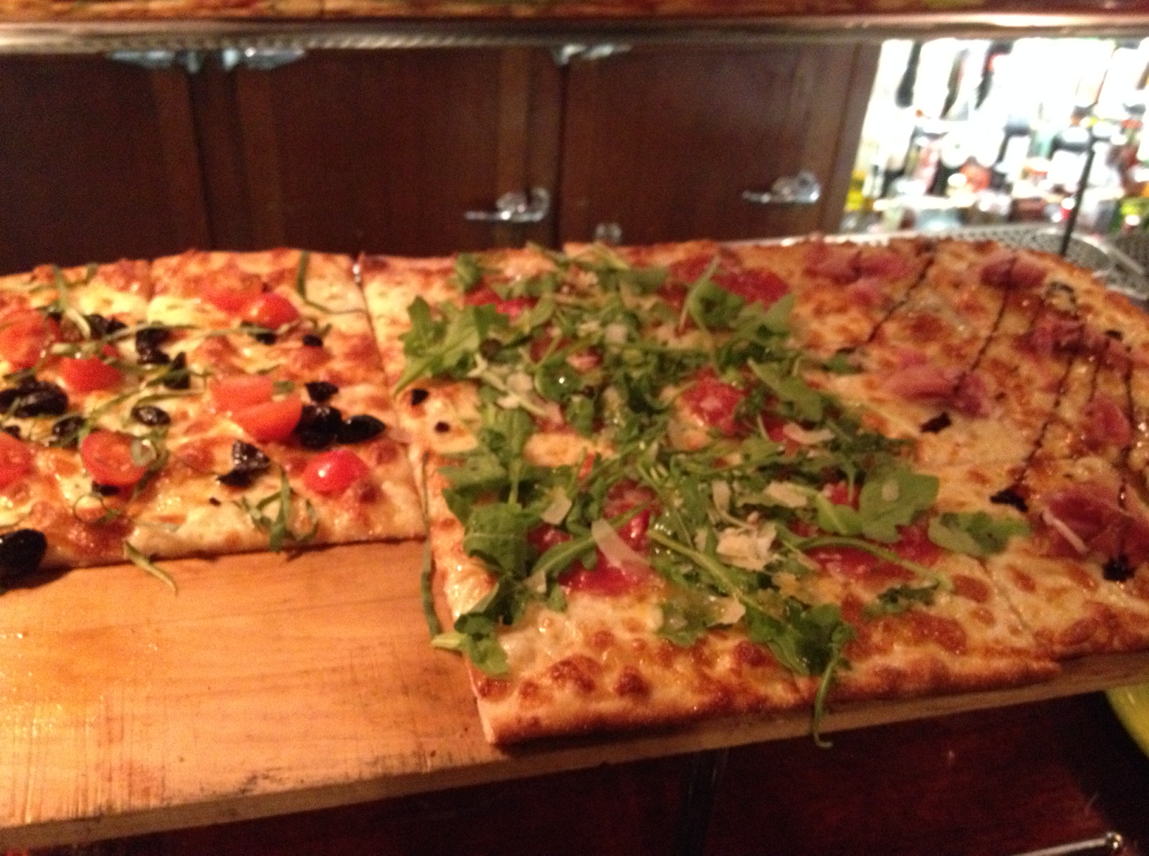I convinced my neighbor to join me at Tony’s (again) to try his Roman (long thin) pizza. I wanted to compare it to the kilos of stuff we ate in Rome. First, the comparison bit was difficult. In Rome, this style pizza is sold by the kilo (or ette/100g), and has usually been out of the oven for a while. At Tony’s, it is not sold “by the ette”, and comes out of the oven to your table (or to the bar as the case may be). The verdict (below) was pleasing, although I’m not a fan of “sweet” pizza. I also liked the thin crust. In fact the bar keep said this was the thinnest pizza served (I thought the neopolitan was quite thin). In any event, it was thinner than the pizza we ate in Rome. In fact, one pizzeria in Monte Verde Vecchio won accolades for their crust, which had a higher ratio of levaning and rose for three days before it was baked.